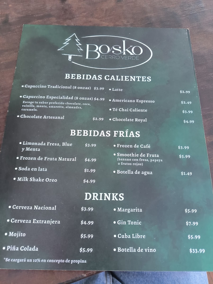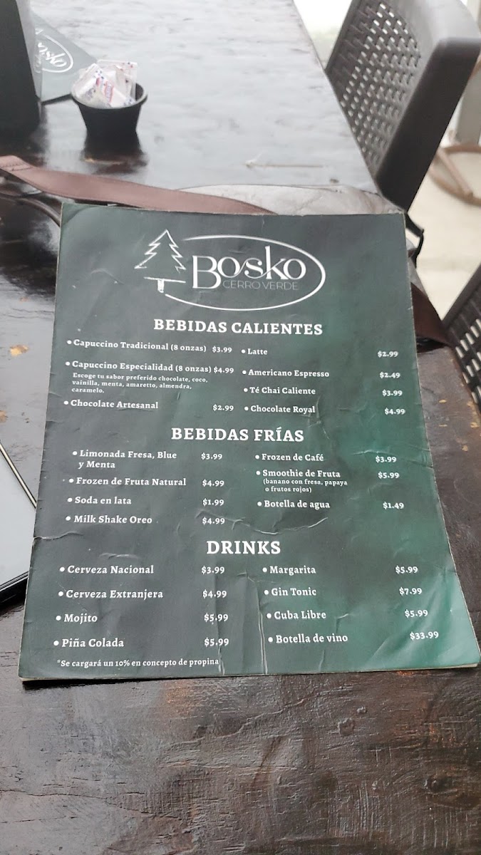 The menu at Bosko Cerro Verde offers a blend of comforting, well-crafted dishes and drinks that complement its tranquil, nature-surrounded setting. Whether you're starting your day with a thoughtfully prepared breakfast or settling in after a hike, the selection balances casual dining with satisfying flavors.