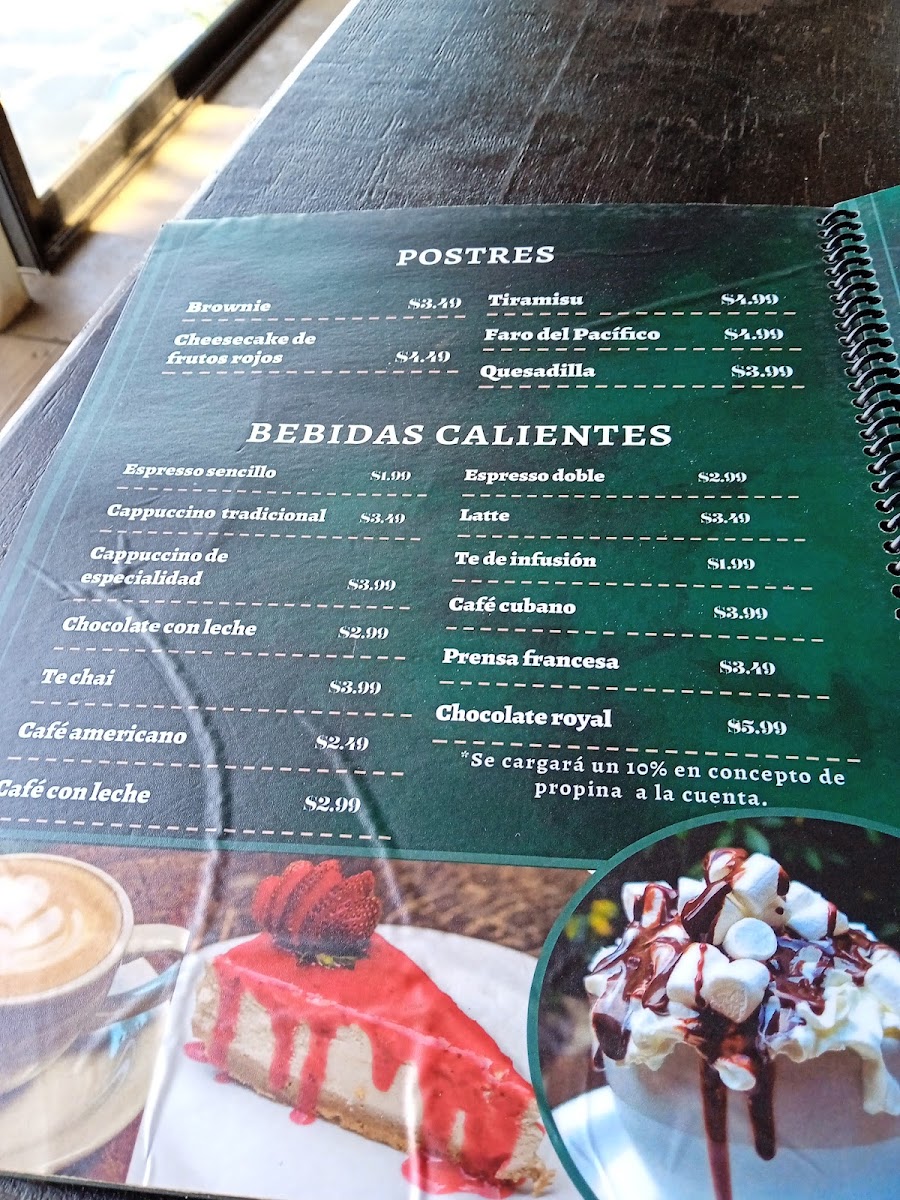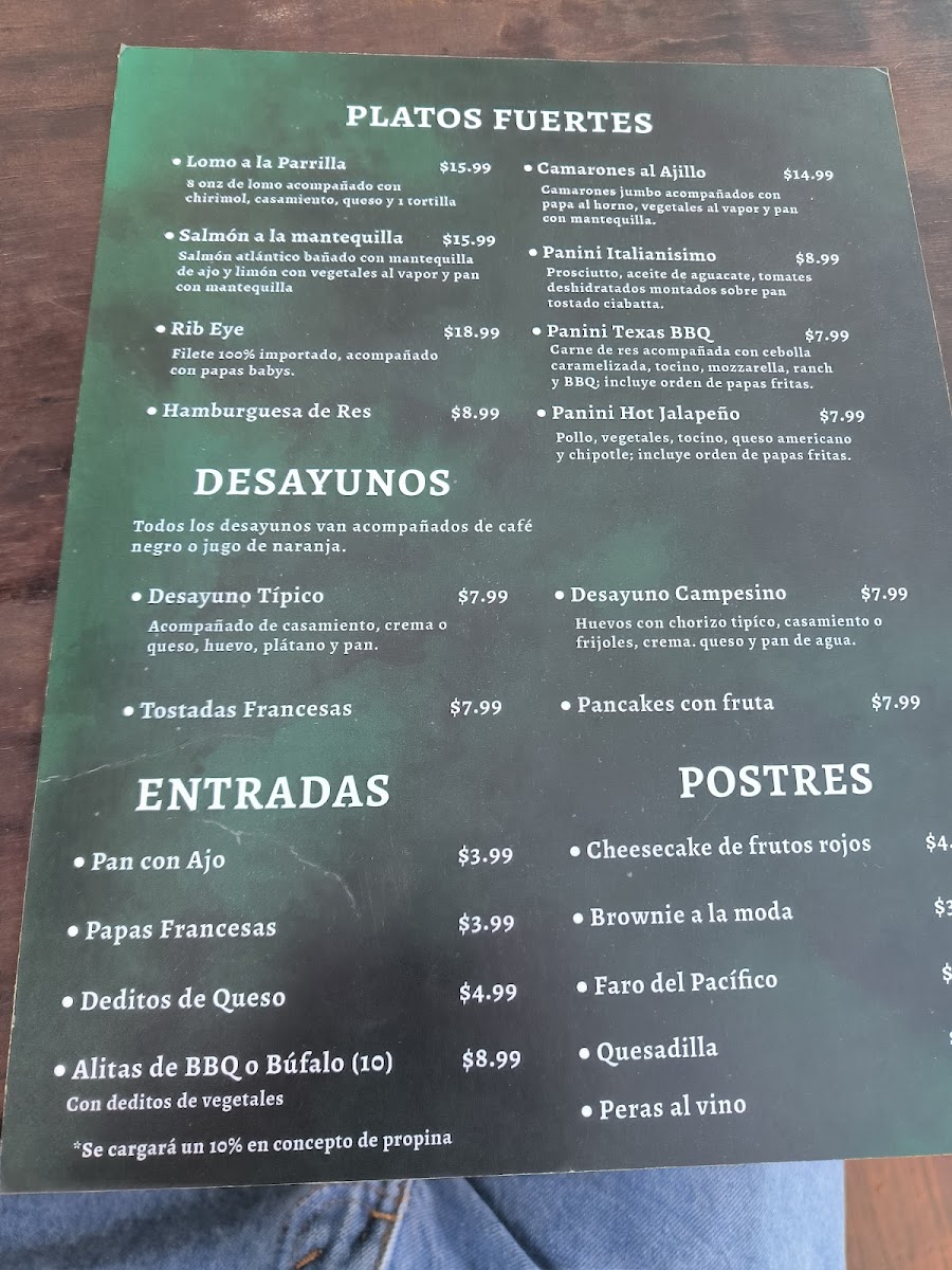 Guests can expect simple yet satisfying options like the hearty Lomo De Res or the rich, indulgent Hamburguesa Deluxe, perfect for a relaxed lunch or dinner. For a sweet moment, treats like the Cheesecake Frutos Rojos provide a comforting finish alongside fresh coffee or other warm beverages. Light bites and refreshing choices such as the Faro del Pacífico round out the menu, fitting the calm atmosphere and rustic surroundings.